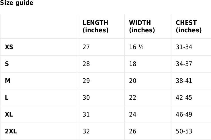 XS: Width 16.50, Length 27.01, Sleeve 8.62