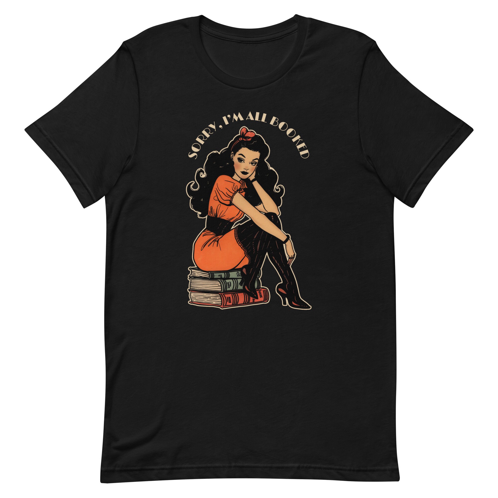 Vintage Pin-up 'All Booked' T-shirt - Retro Style for Book Lovers - Bella + Canvas 3001 in Black, and Black Heather