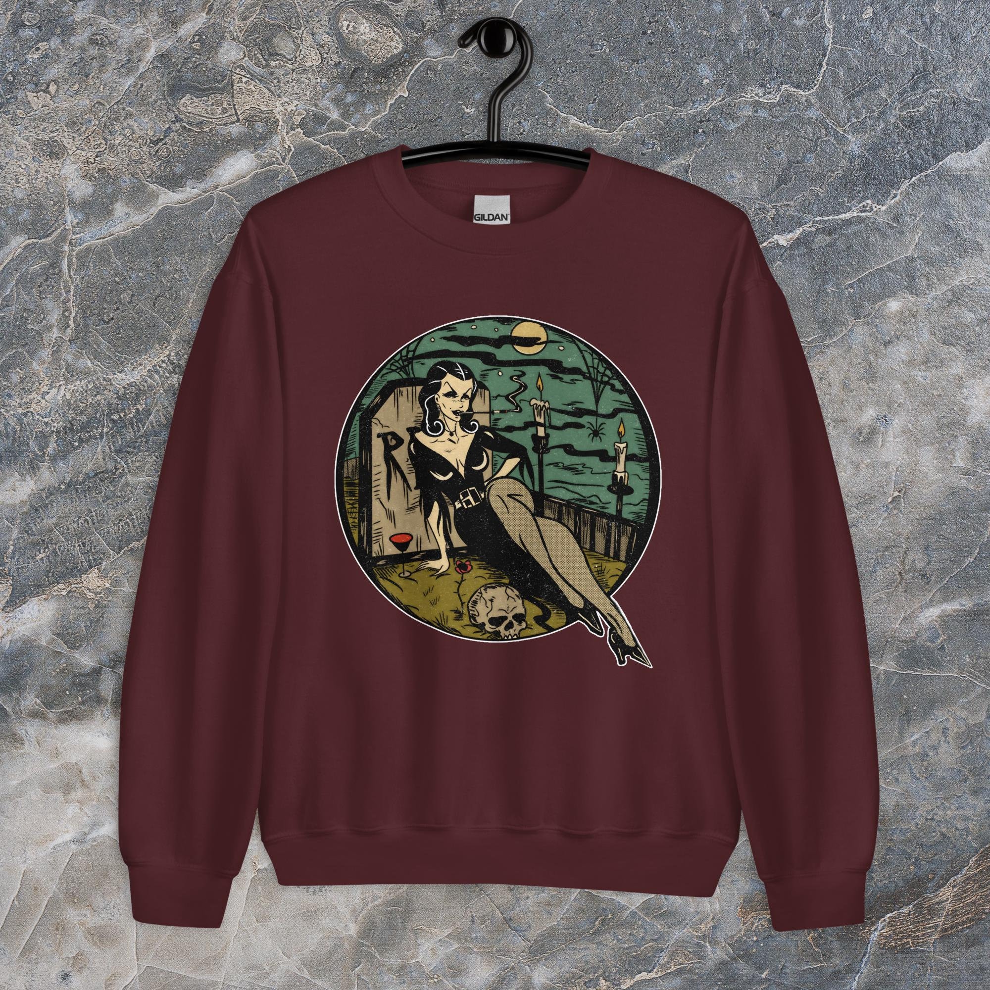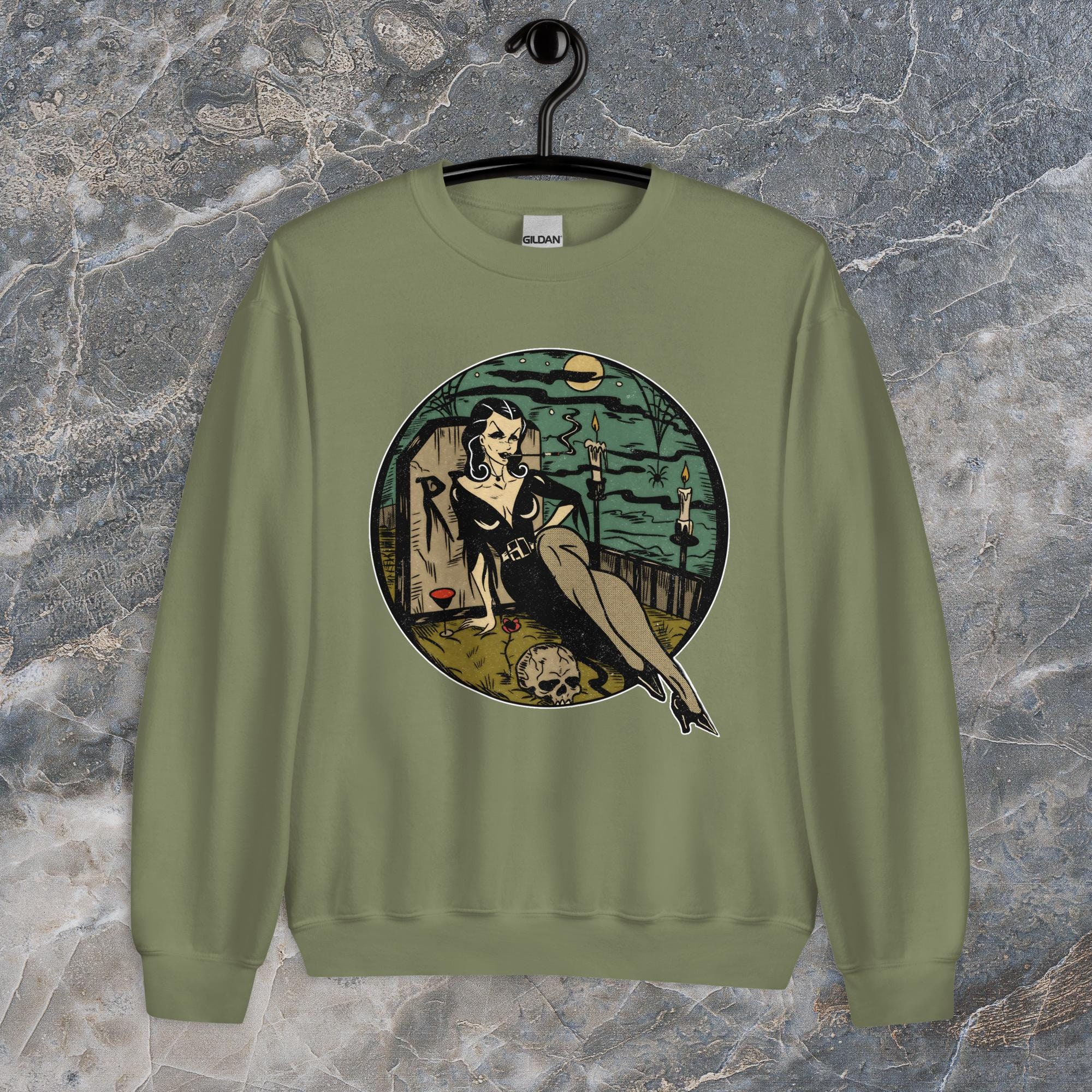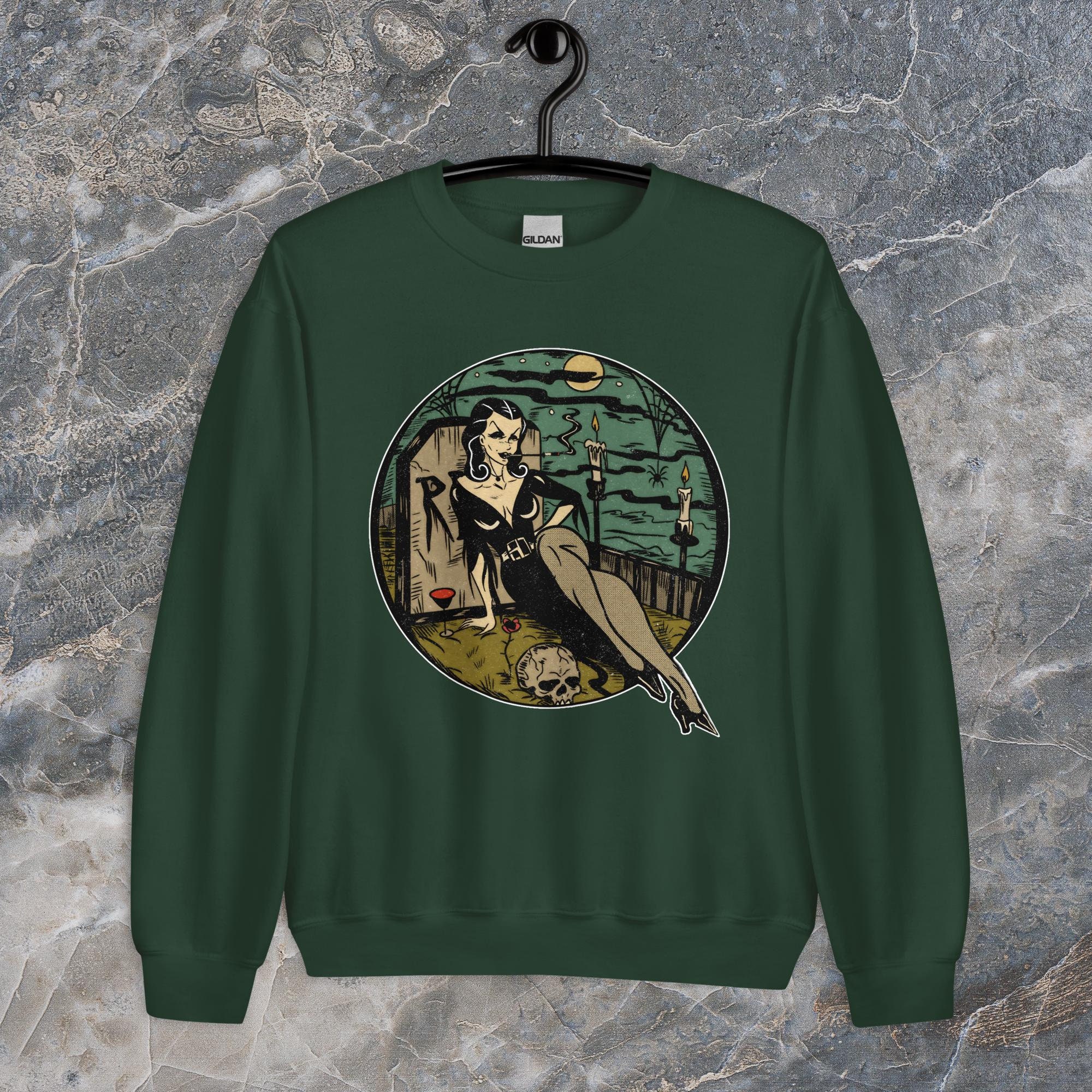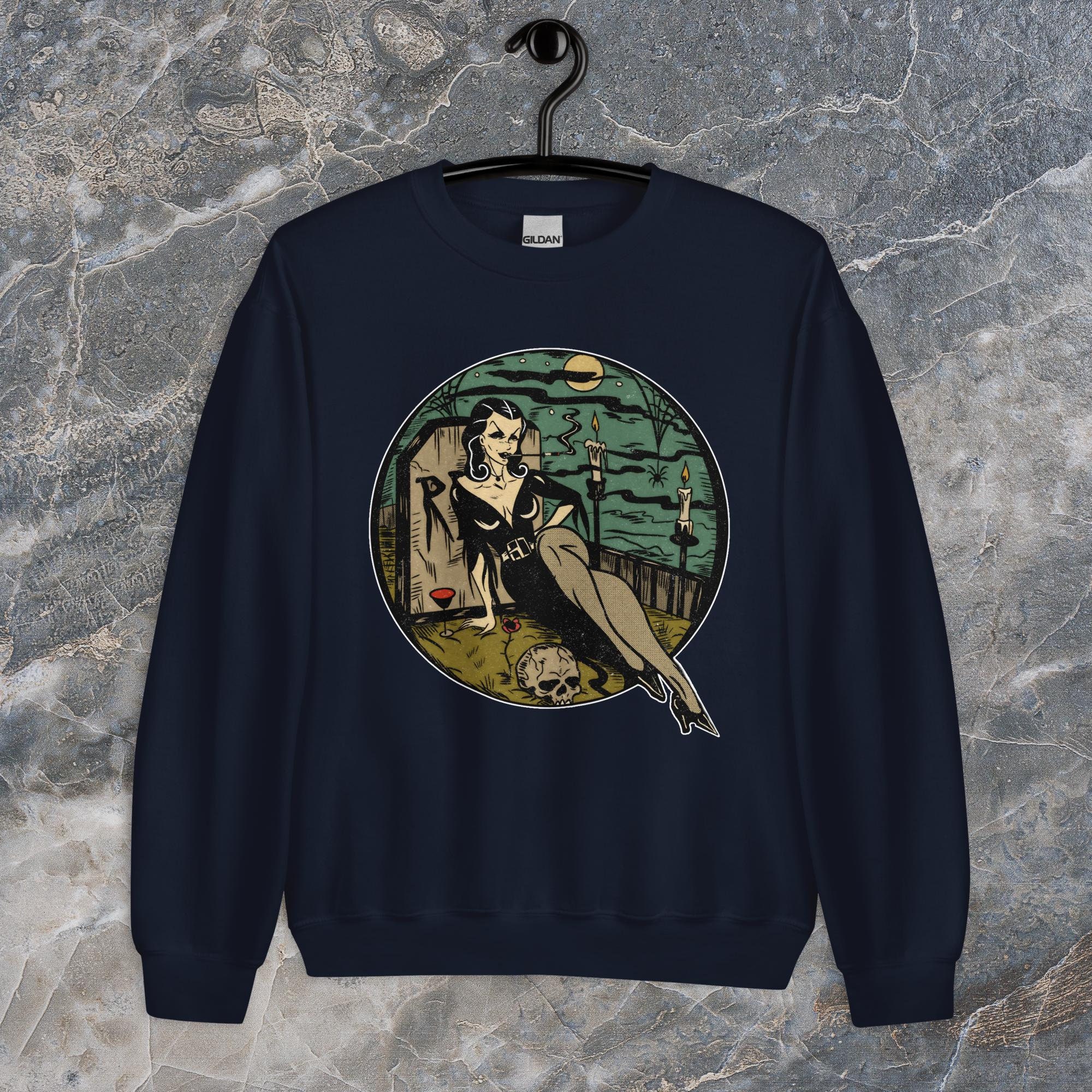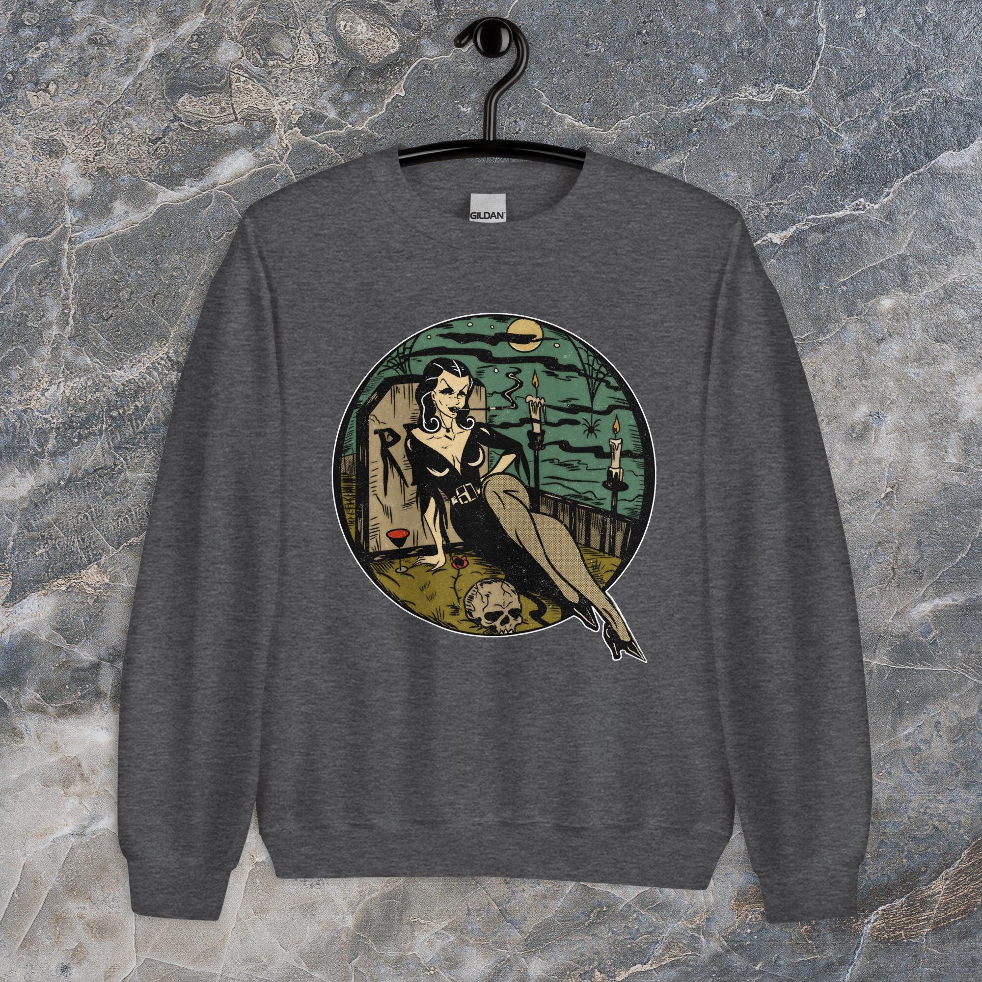 Sink your fangs into this. The Graveyard Vampire sweatshirt is perfect for those chilly nights spent lurking in cemeteries or just binge-watching horror movies. It's got that classic fit you crave, but it's built to last. Made with a super soft, air-jet spun yarn, it's so comfortable it's scary. Plus, it's pre-shrunk, so you don't have to worry about it losing its shape after a few too many moonlight strolls.