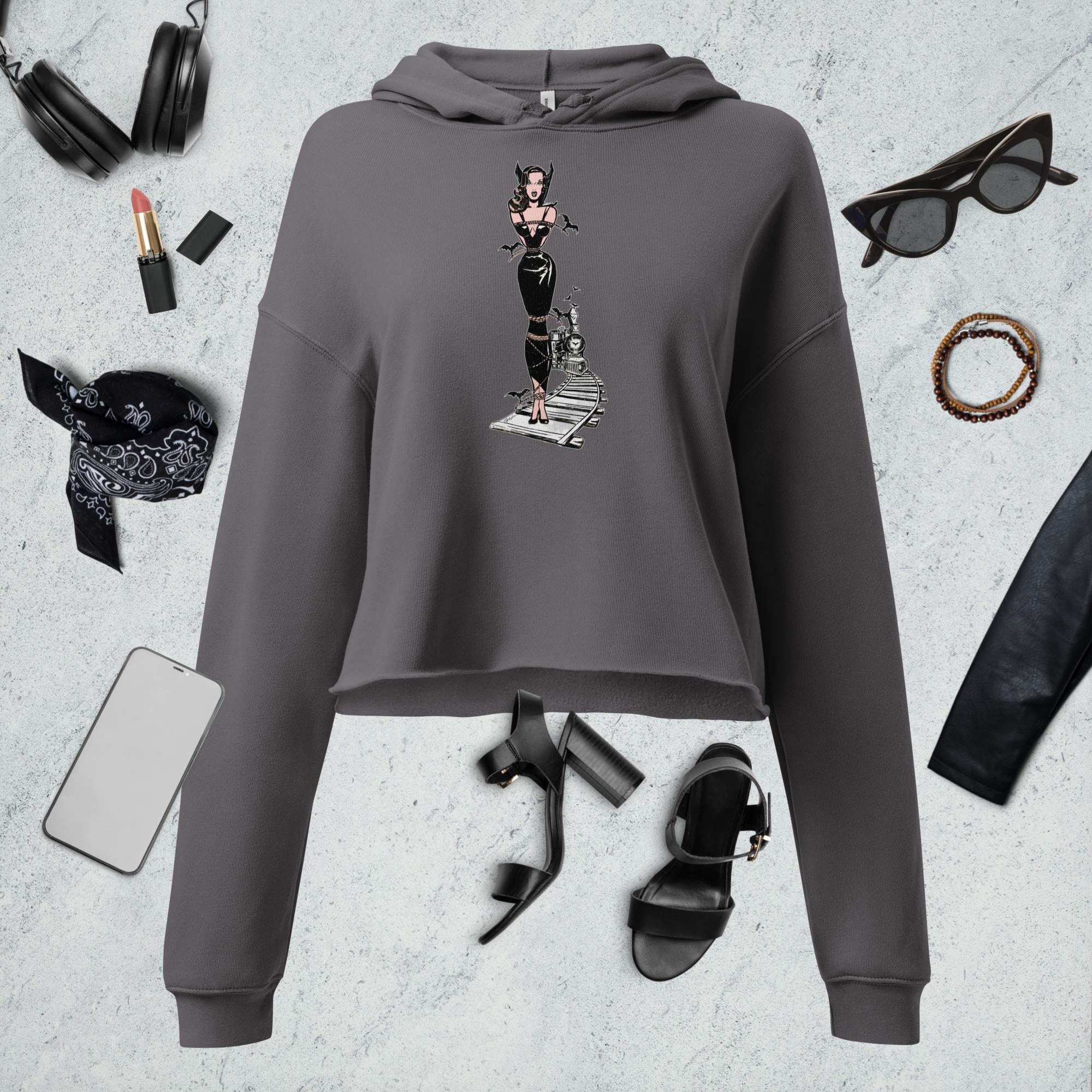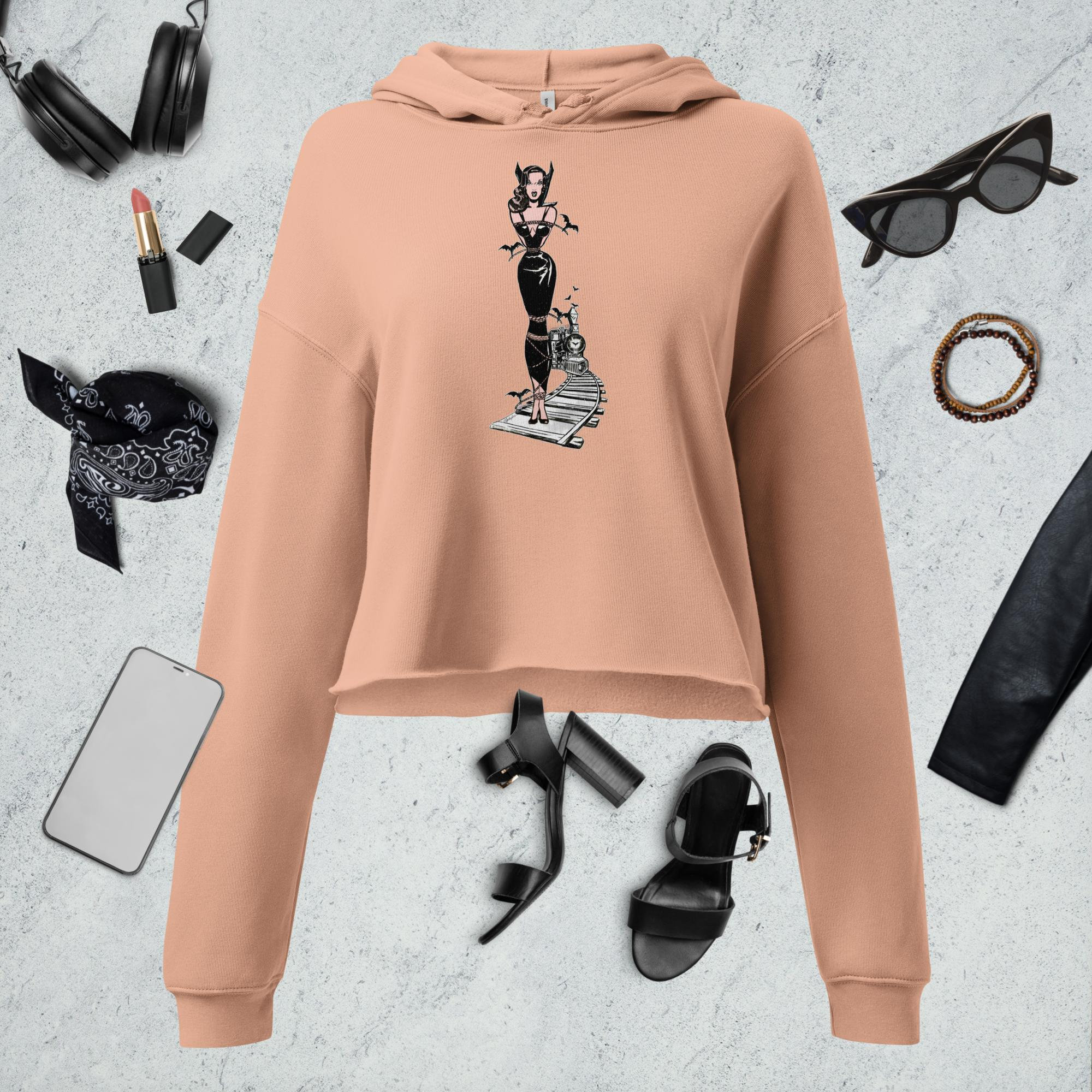 Ride into the night with this edgy, vintage-inspired crop hoodie. Featuring a unique illustration of a vampire pin-up girl leaning against a spooky sign on a desolate road, this hoodie is a perfect blend of dark romance and classic tattoo art. The raw hem and dropped shoulder cut give it a modern, casual look, while the comfortable fleece fabric makes it a cozy go-to. This is the perfect piece for anyone who embraces the night and a style that's a little bit dangerous.