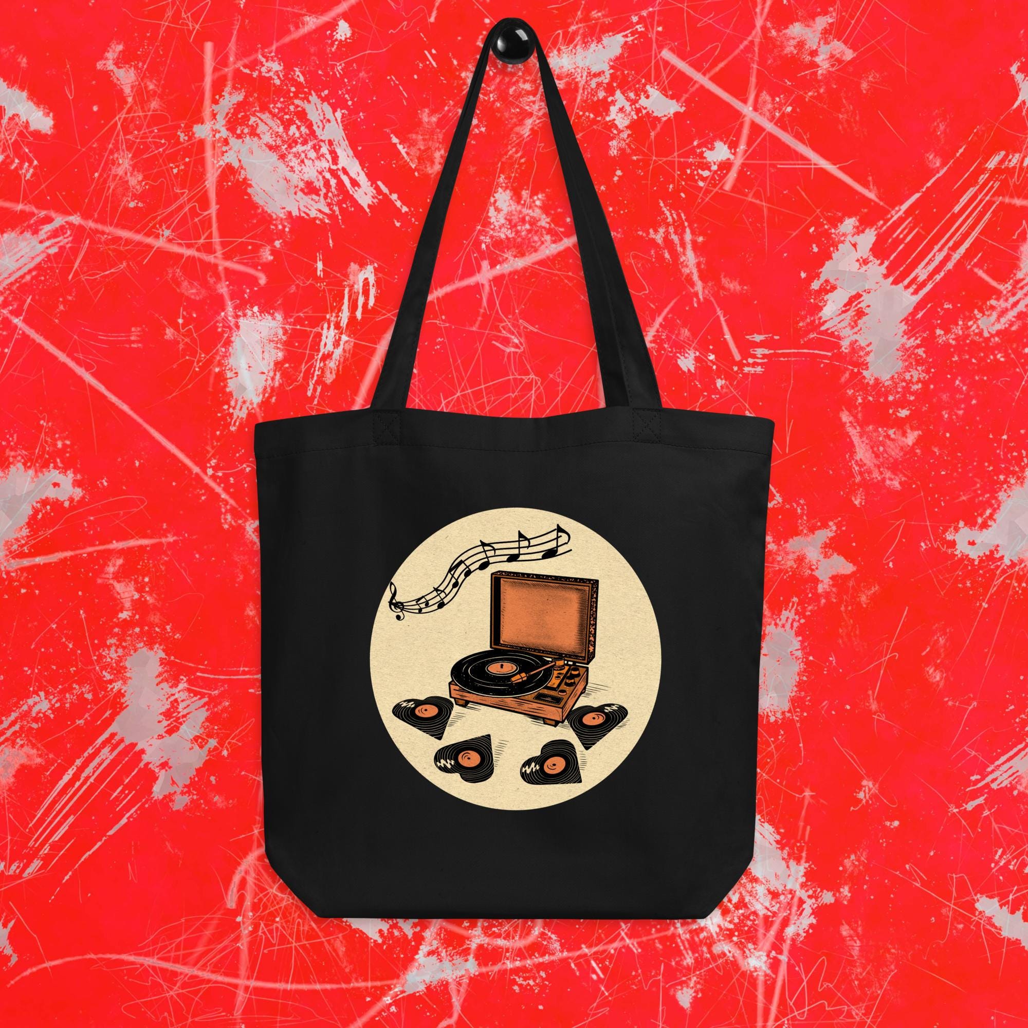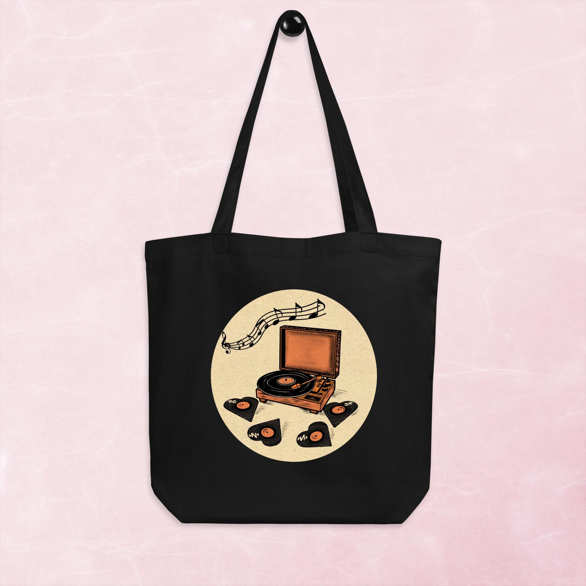 Vintage Vinyl Record Player Tote, Vintage-Inspired Turntable & Heart-Shaped Vinyl LPs | Eco Tote Bag | Econscious EC8000