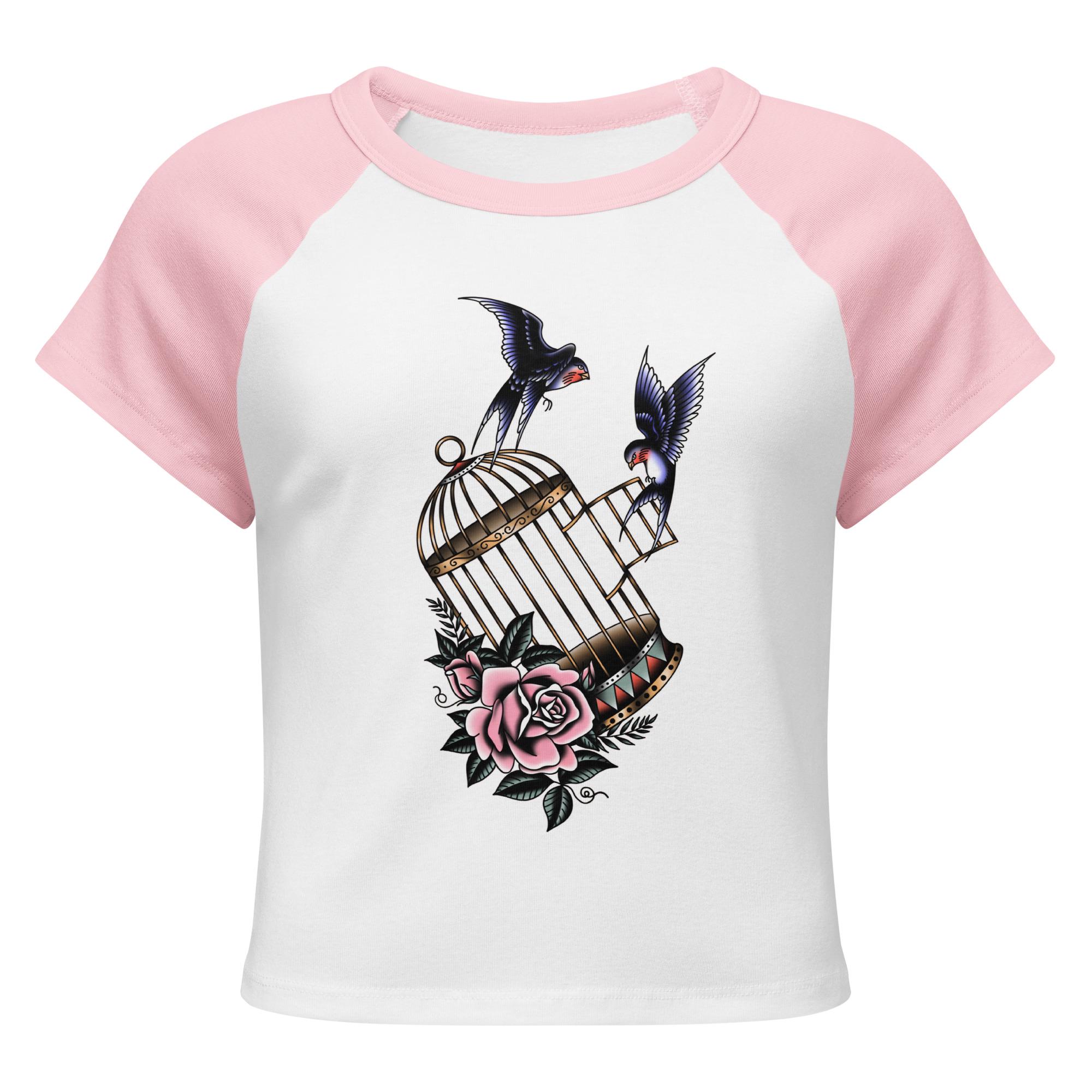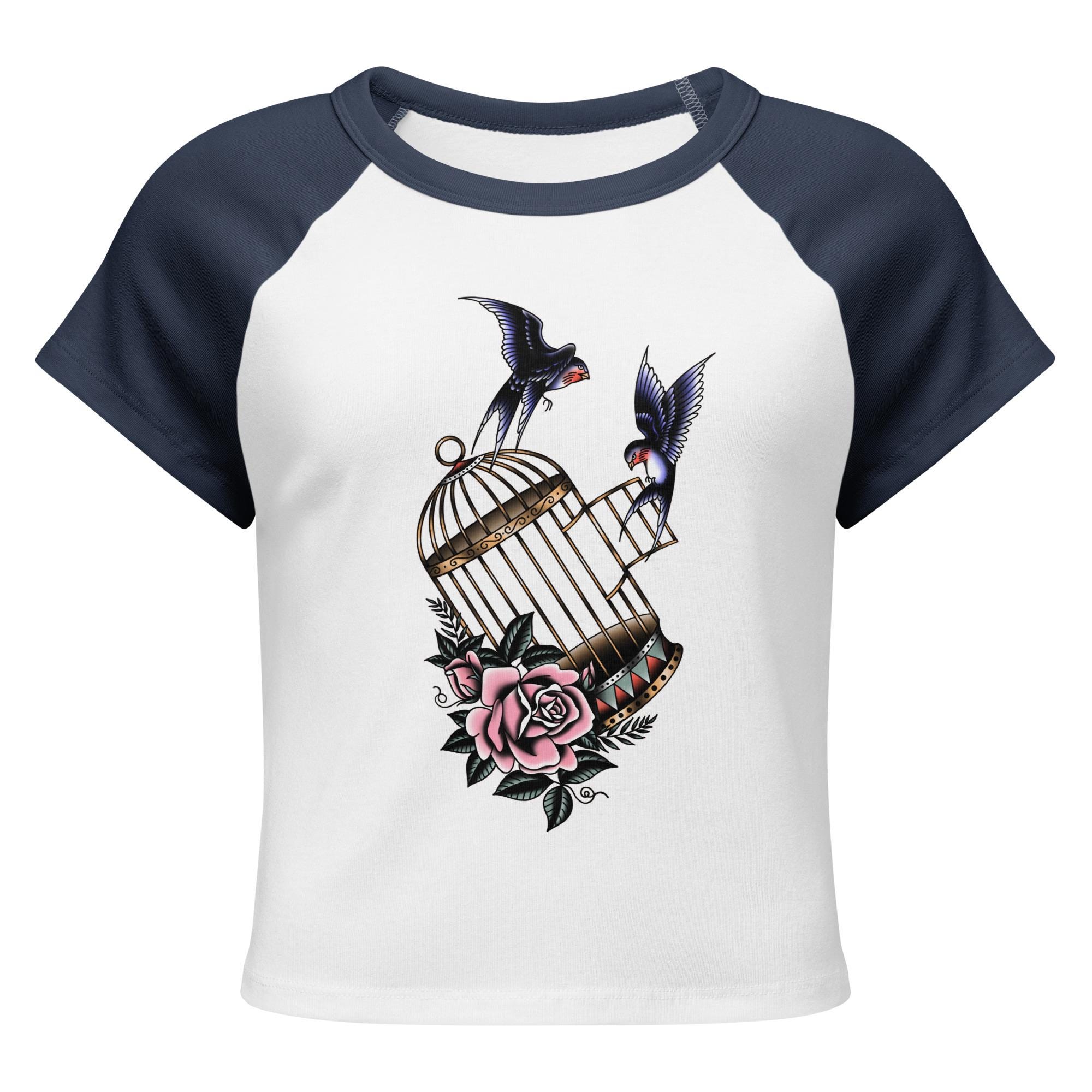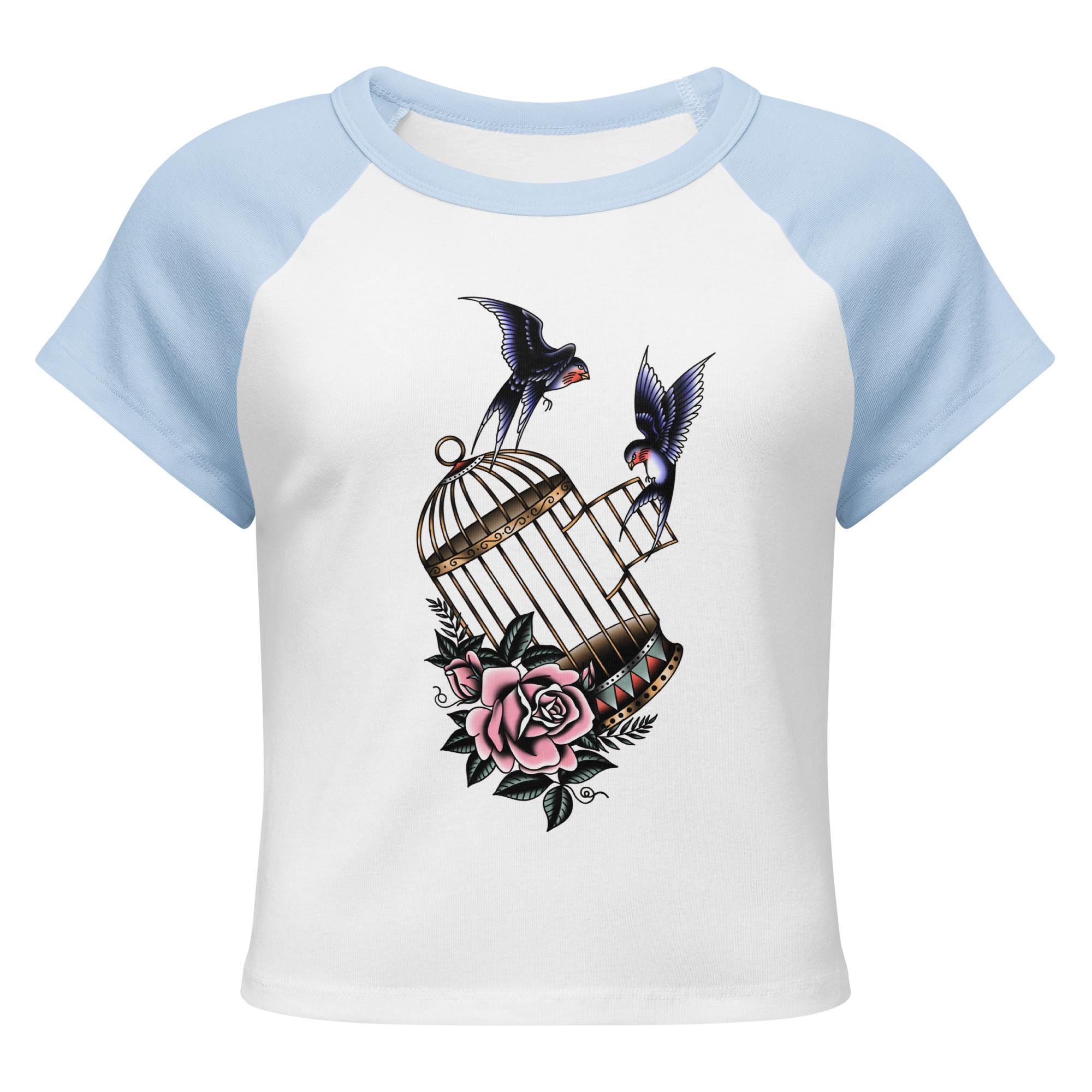 Set your style free with this beautiful, vintage-inspired baby tee. Featuring a classic tattoo flash graphic of two swallows escaping from an ornate birdcage, this top is a symbol of freedom and defiance. The soft, micro-rib fabric provides a comfortable fit with a cropped cut, giving it a modern edge. It's the perfect top for anyone with a free-spirited heart and a love for classic tattoo art.