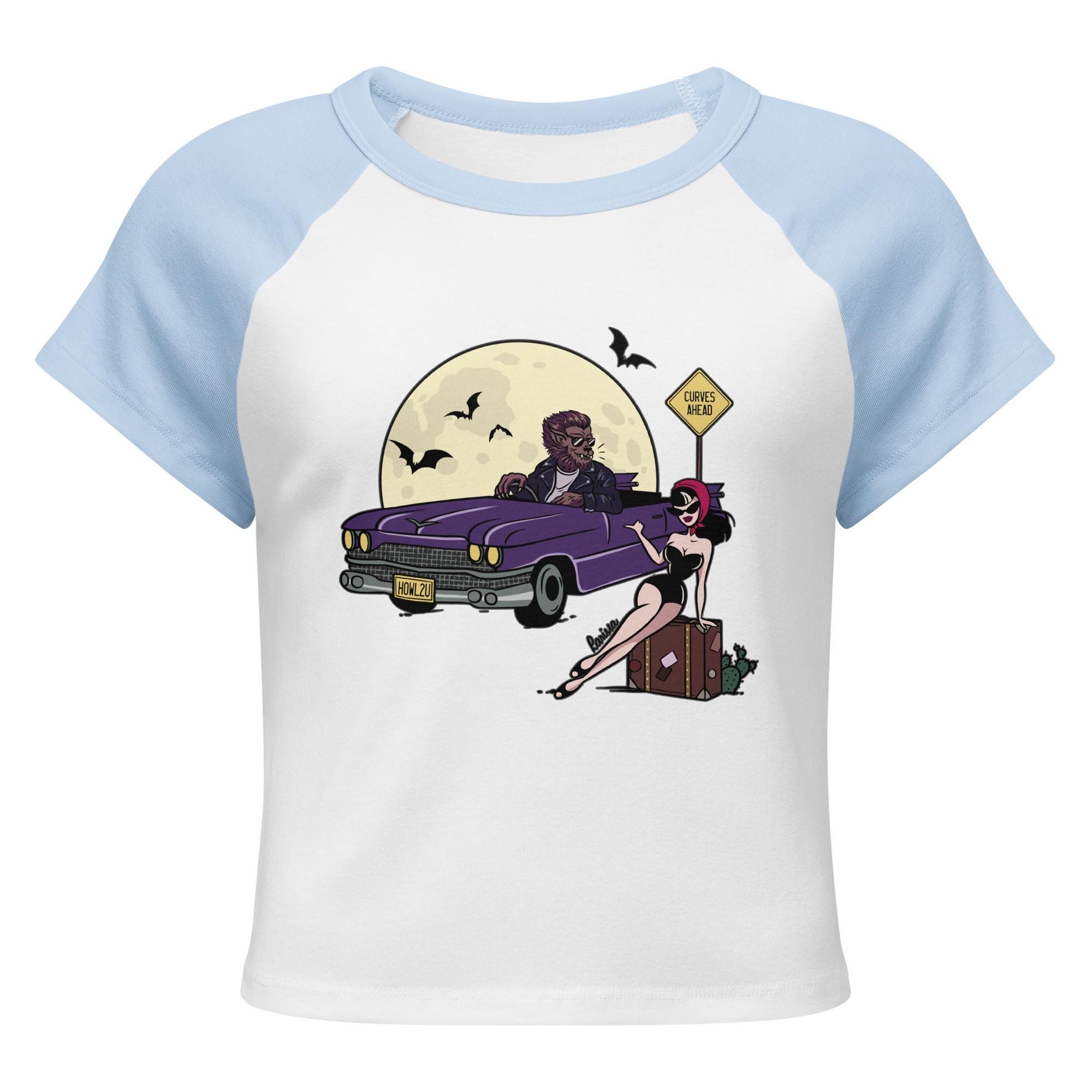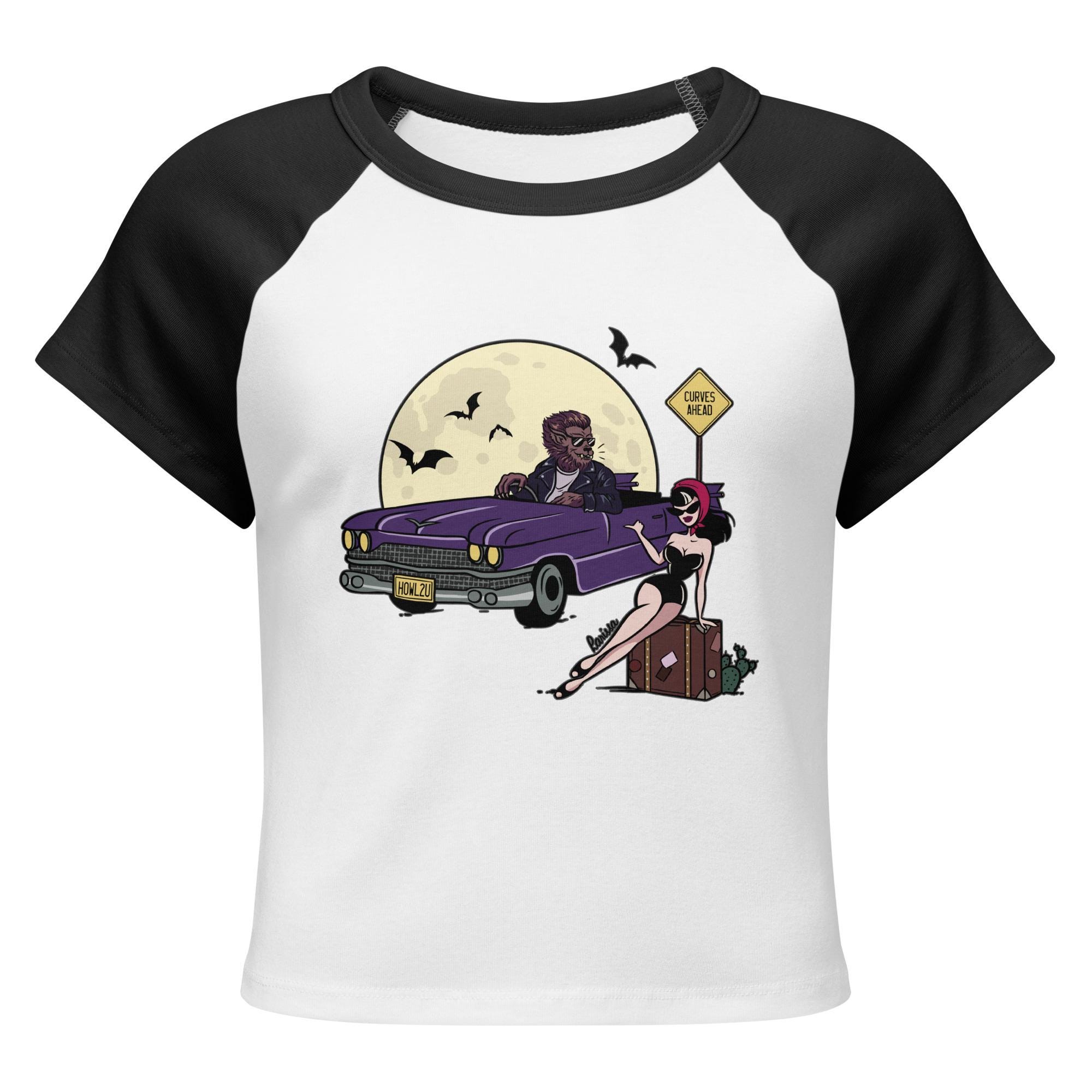 Unleash your wild side with this classic horror-inspired baby tee. Featuring a vintage tattoo flash graphic of a glamorous pin-up girl hitchhiking with a werewolf in a car, this top captures a deliciously dark and mysterious vibe. The soft, micro-rib fabric provides a comfortable fit with a cropped cut, giving it a modern feel. It's the perfect top for anyone with a taste for the spooky and a style that's out of this world.