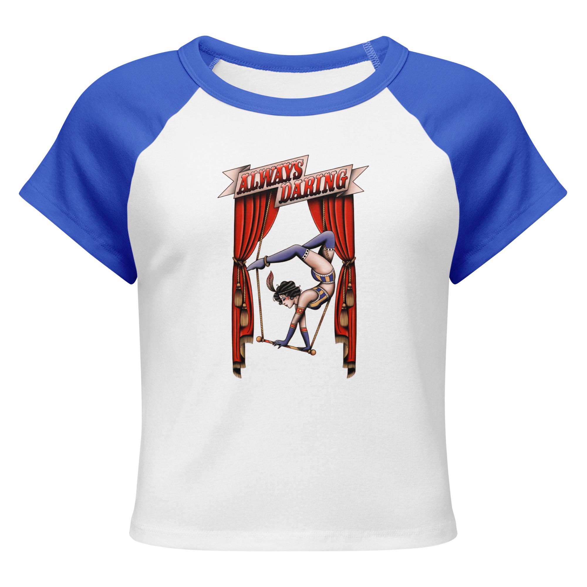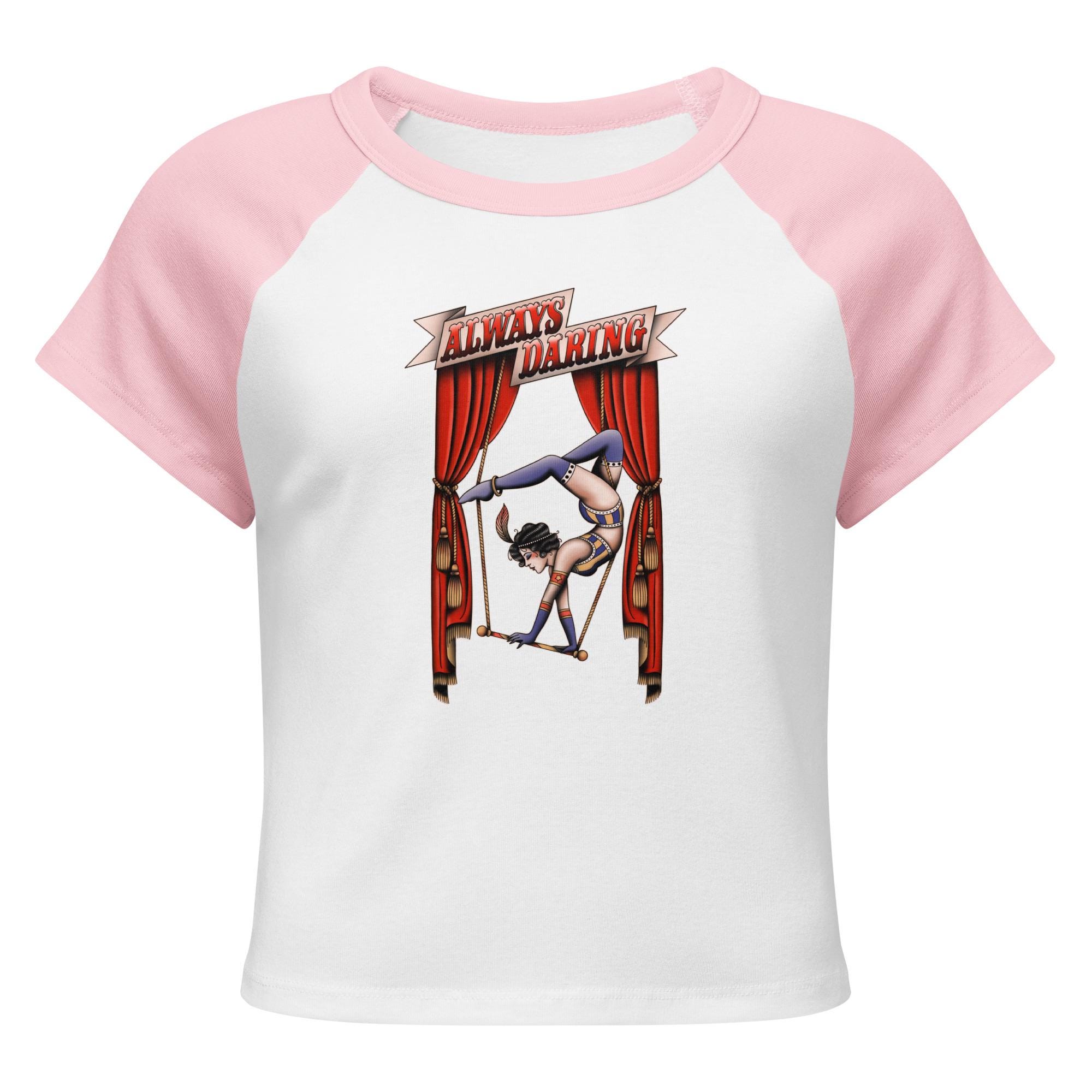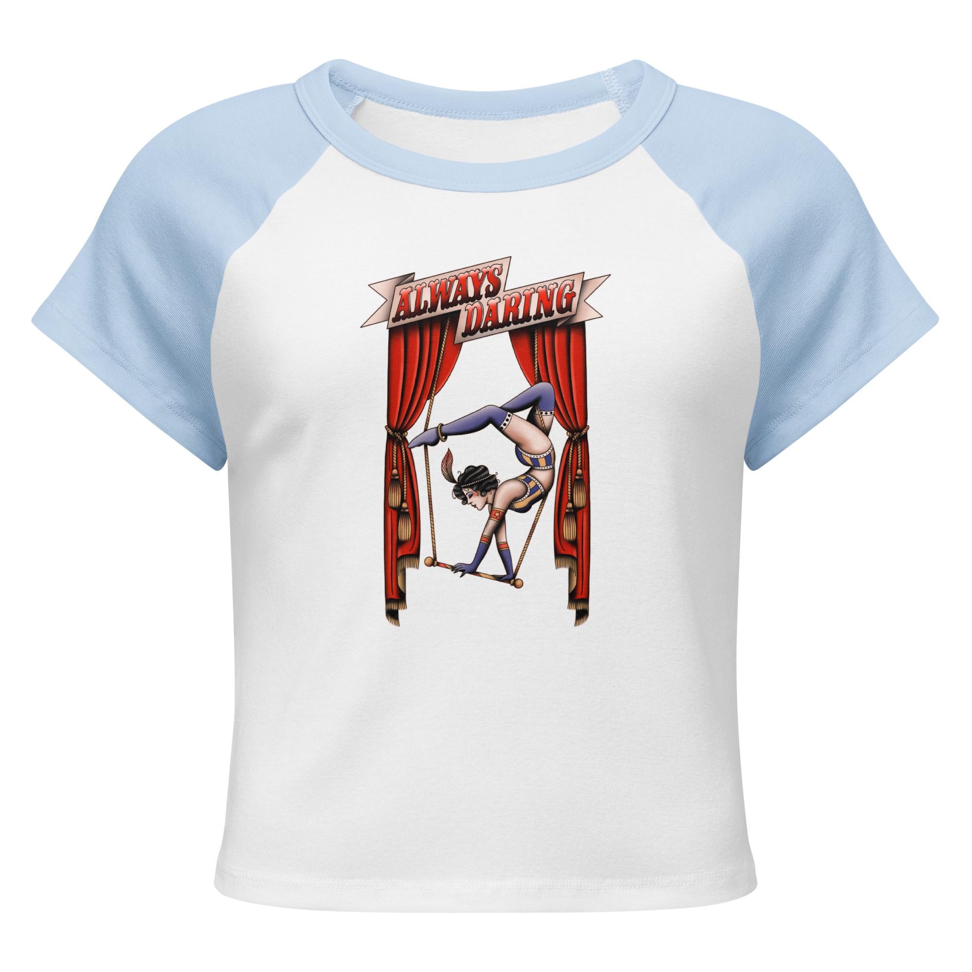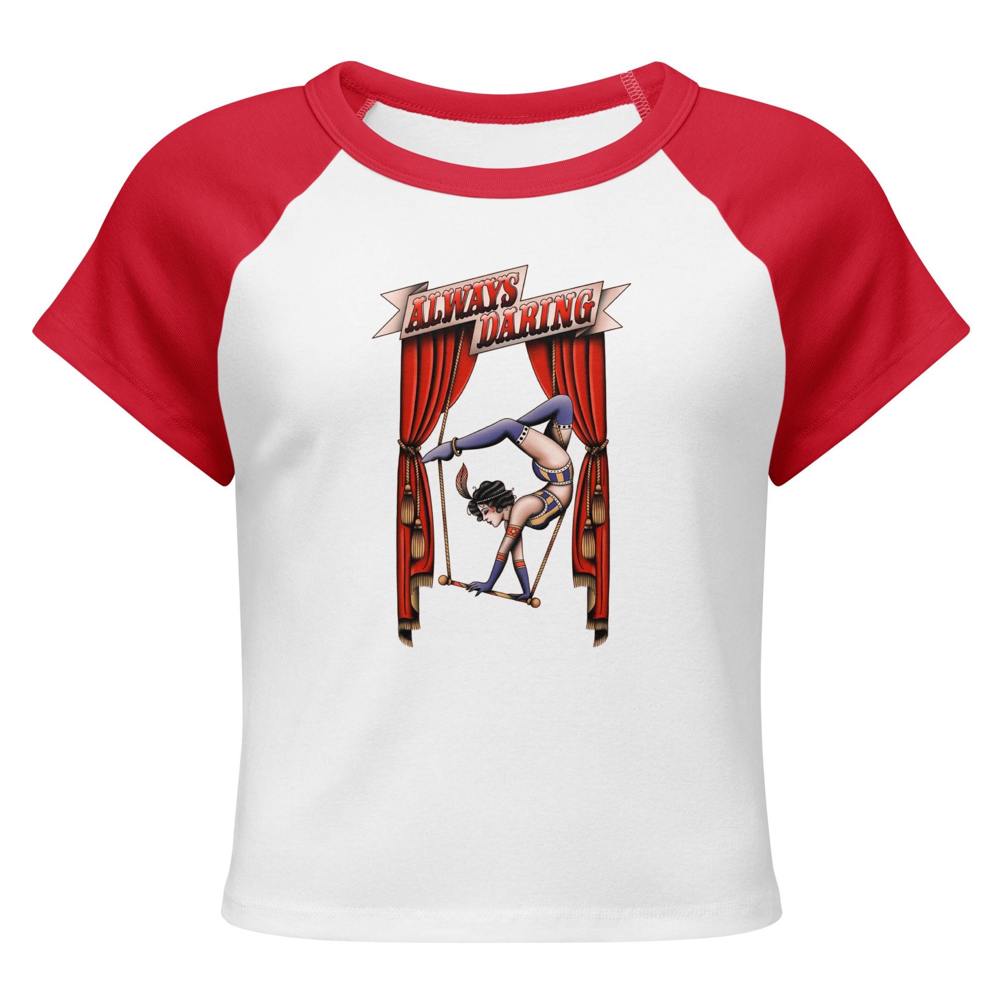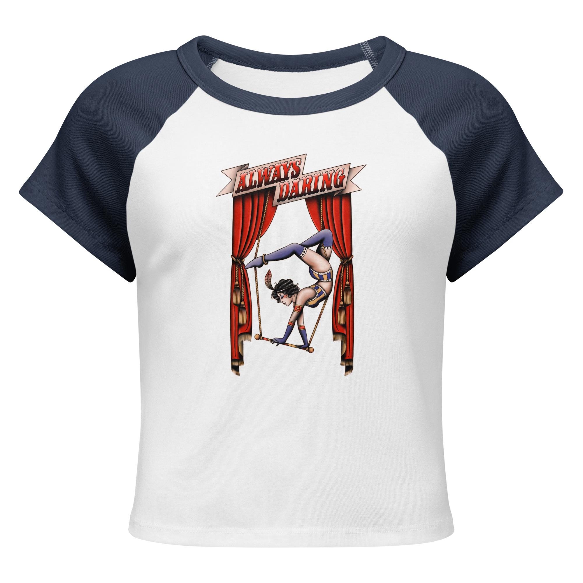 Step into the spotlight with this acrobatic, vintage-inspired baby tee. Featuring a classic tattoo flash graphic of a trapeze artist gracefully suspended in mid-air with an "Always Daring" banner, this top is for those who aren't afraid to take risks. The soft, micro-rib fabric provides a comfortable fit with a cropped cut, giving your look a modern edge. It's the perfect top for anyone with a taste for adventure and a style that's always on point.