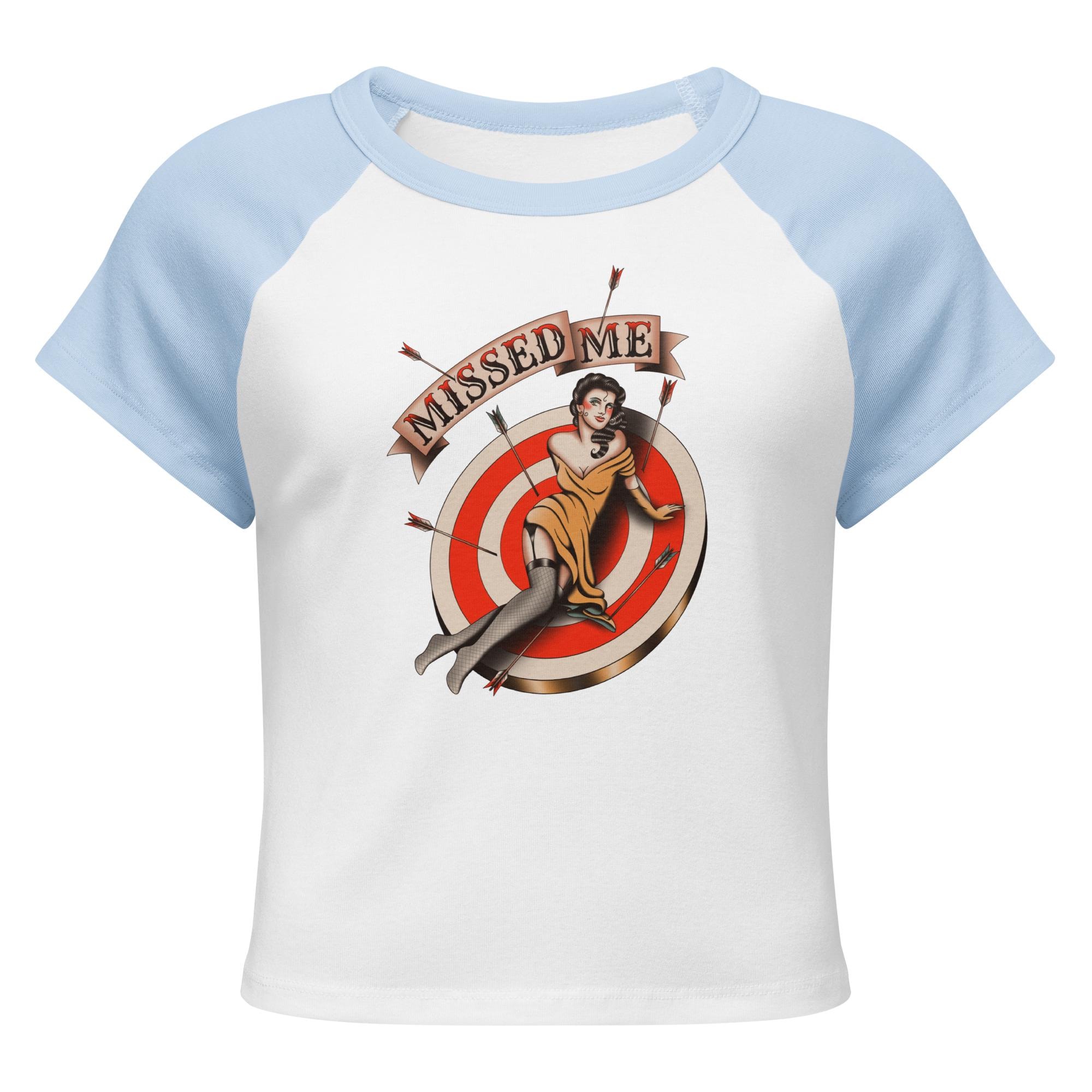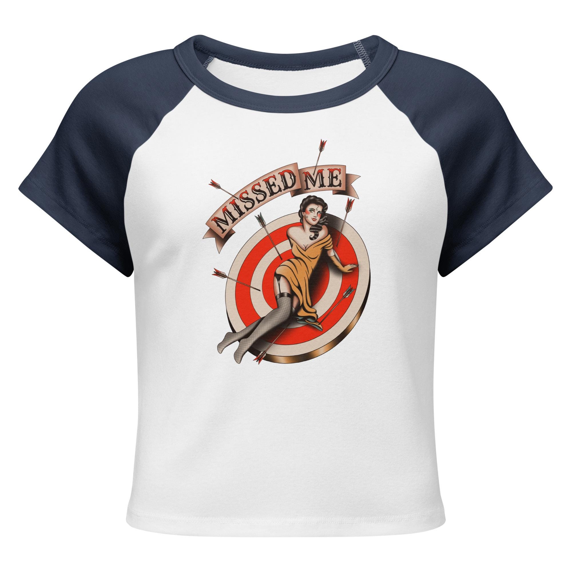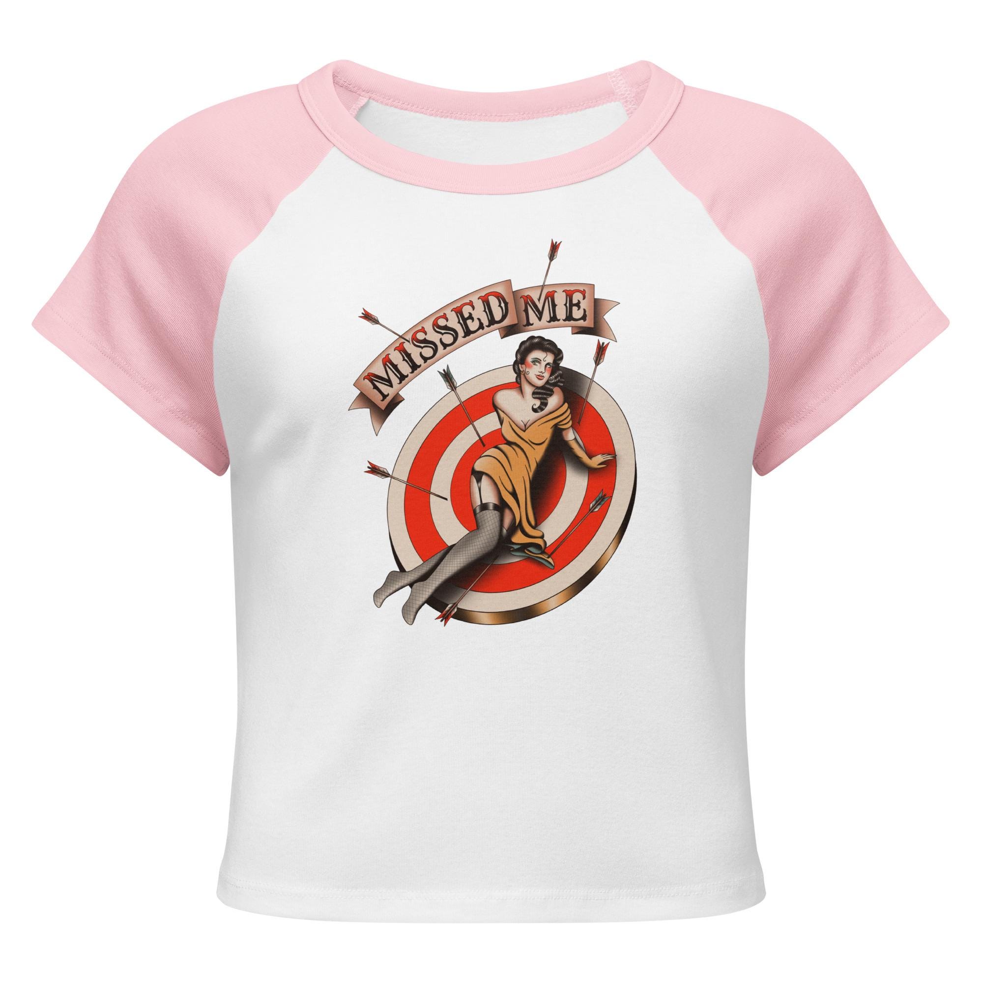 Channel your inner sharpshooter with this throwback baby tee. Featuring a bold graphic of a pin-up darling who's just too quick for Cupid's aim, this soft micro-rib raglan crop top is a bullseye for your casual style. With its contrasting red sleeves and a playfully defiant "Missed Me?" banner, this top hits the mark for vintage-inspired cool. Perfect for pairing with your favorite distressed denim or a slick leather jacket.