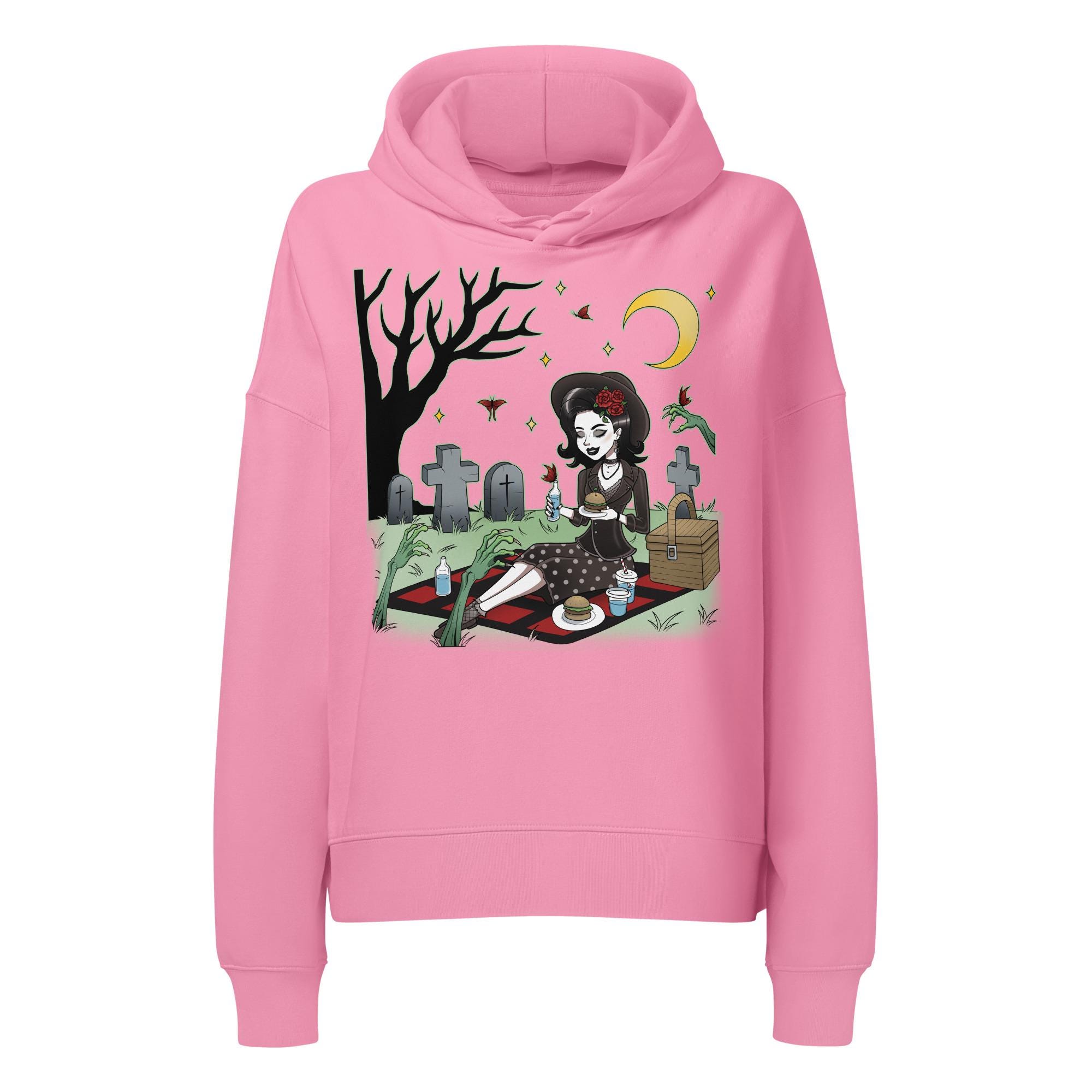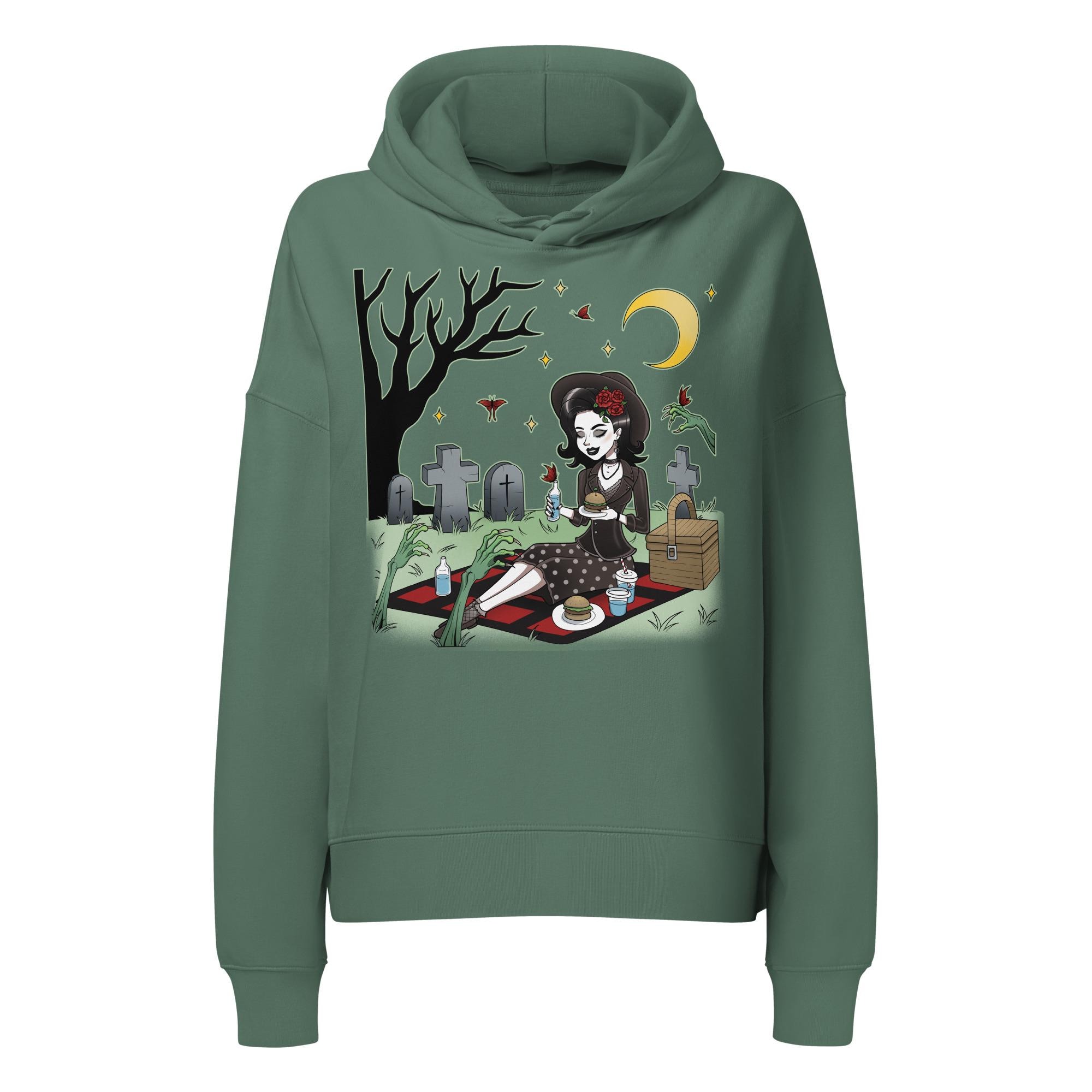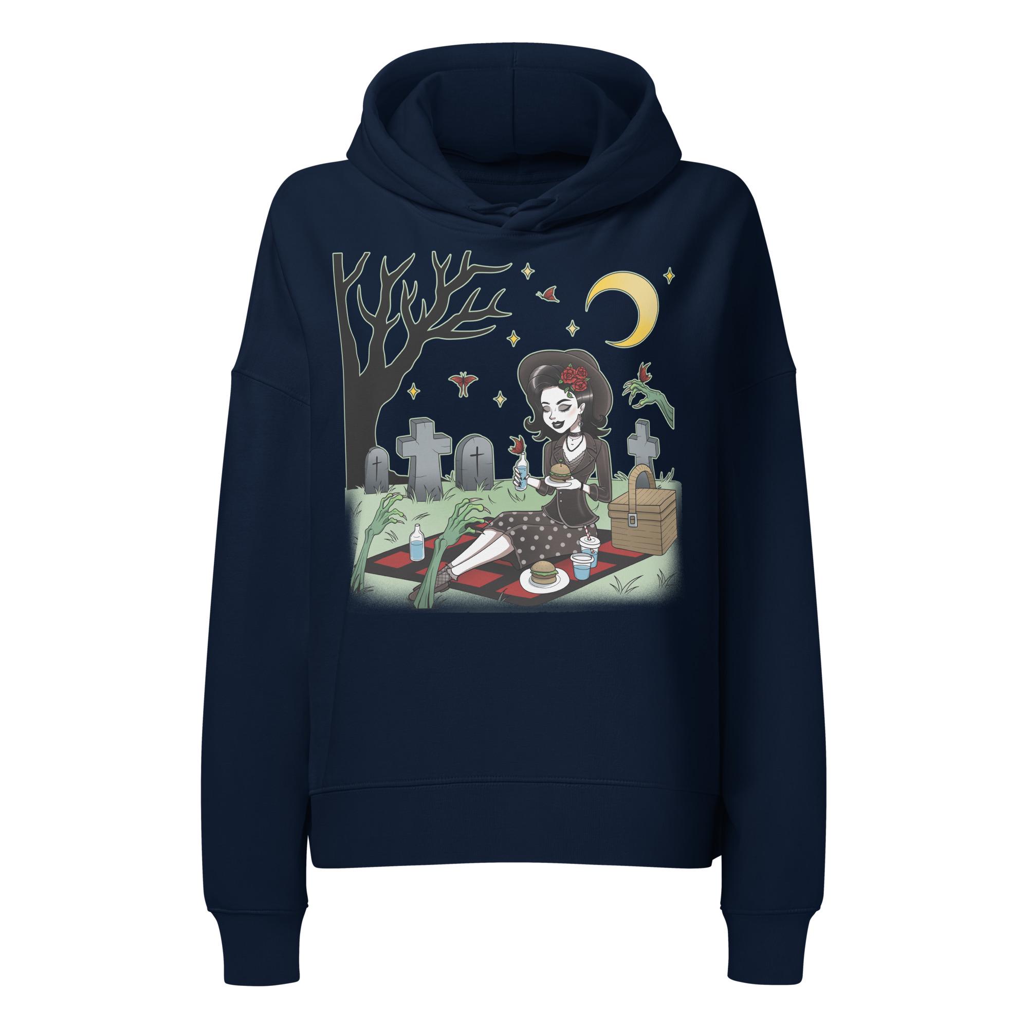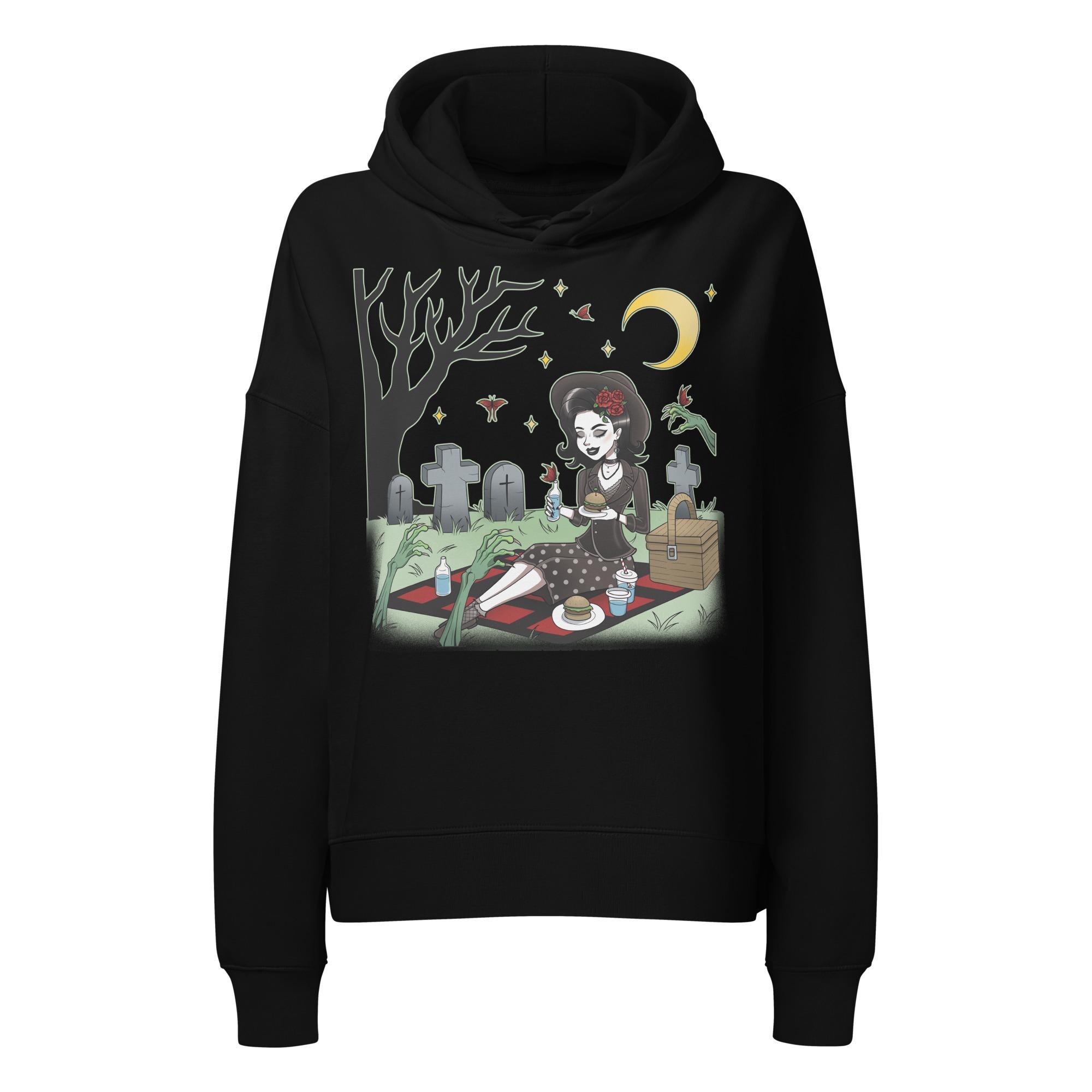 Ditch the drab and embrace the morbidly marvelous with our "Midnight Feast" hoodie. Featuring a classic, pin-up-style vixen enjoying a moonlit picnic right in the heart of the graveyard, this design is for those who find romance in tombstones and prefer their company... a little undead. With zombie hands reaching out for a snack (or maybe just a cuddle?), she's clearly owning her creepy-cute aesthetic.