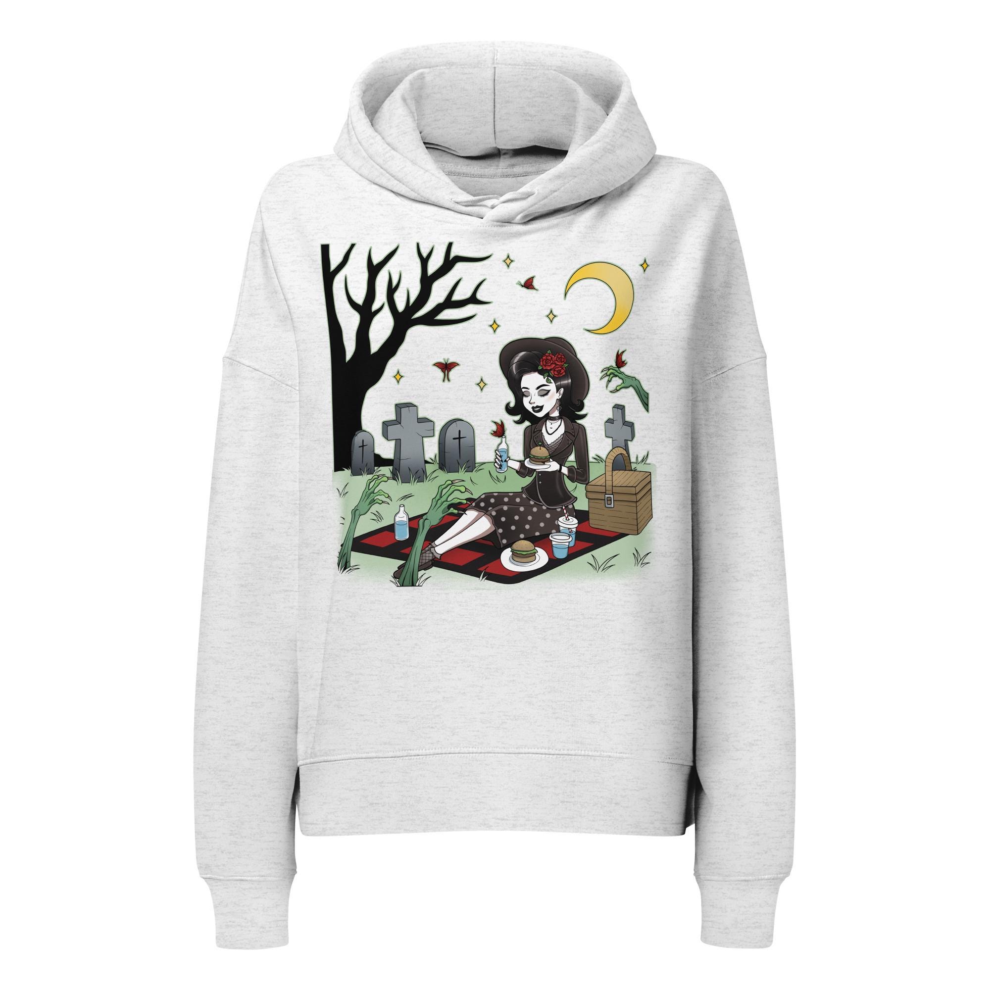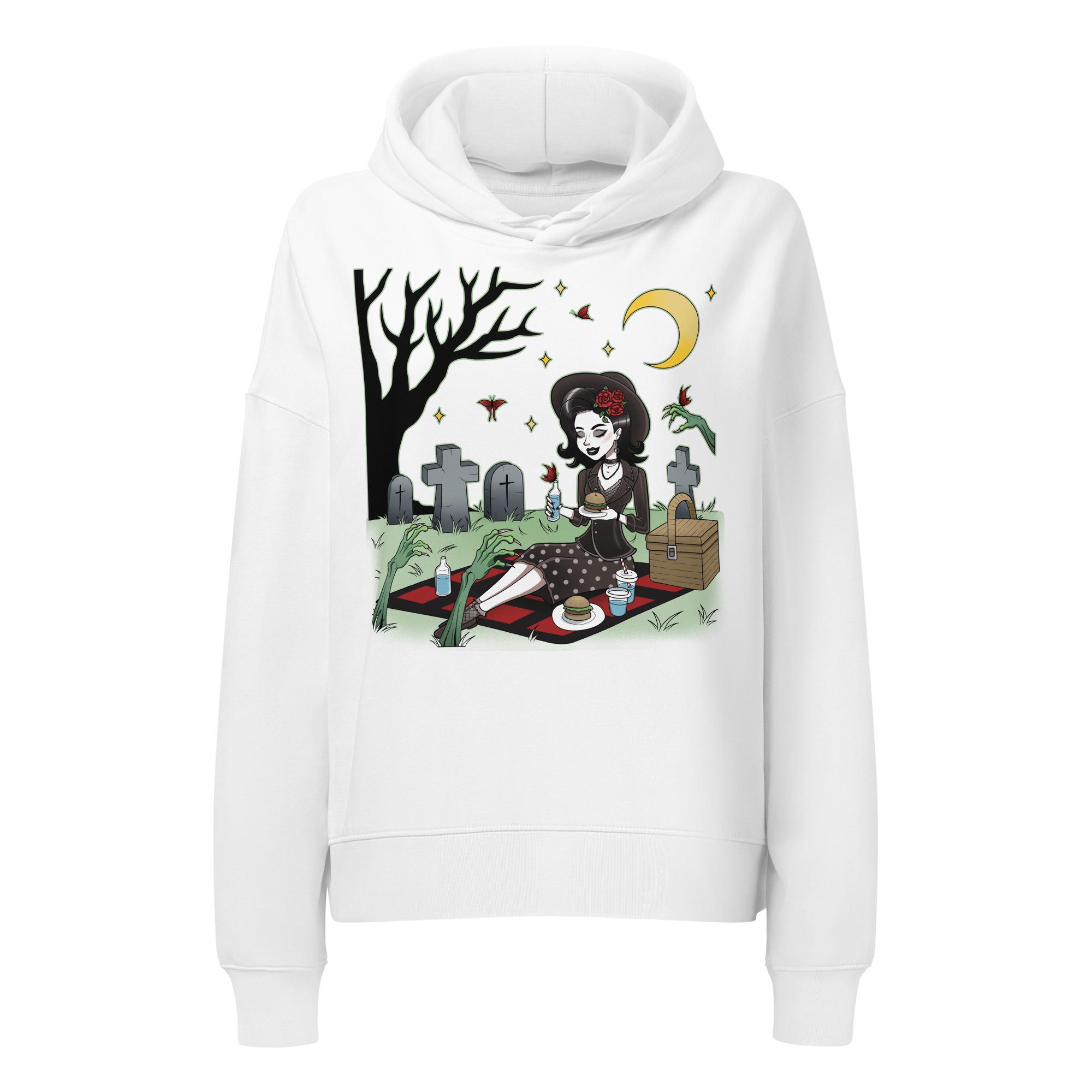Crafted from soft, organic cotton, this mid-weight hoodie offers a relaxed fit with dropped shoulders for ultimate comfort, whether you're haunting the local coffee shop or actually picnicking among the dearly departed. It’s perfect for adding a touch of vintage macabre to your everyday look.